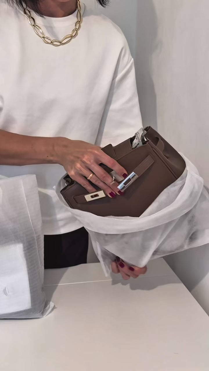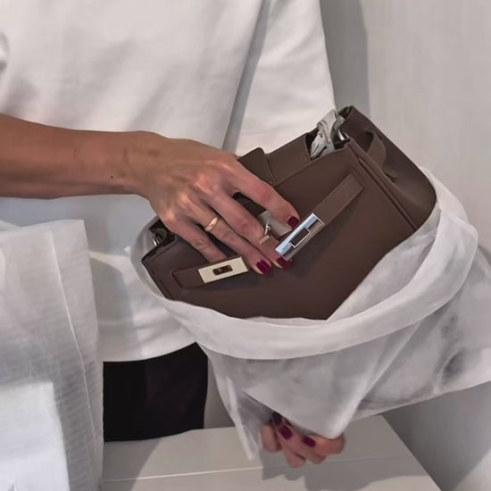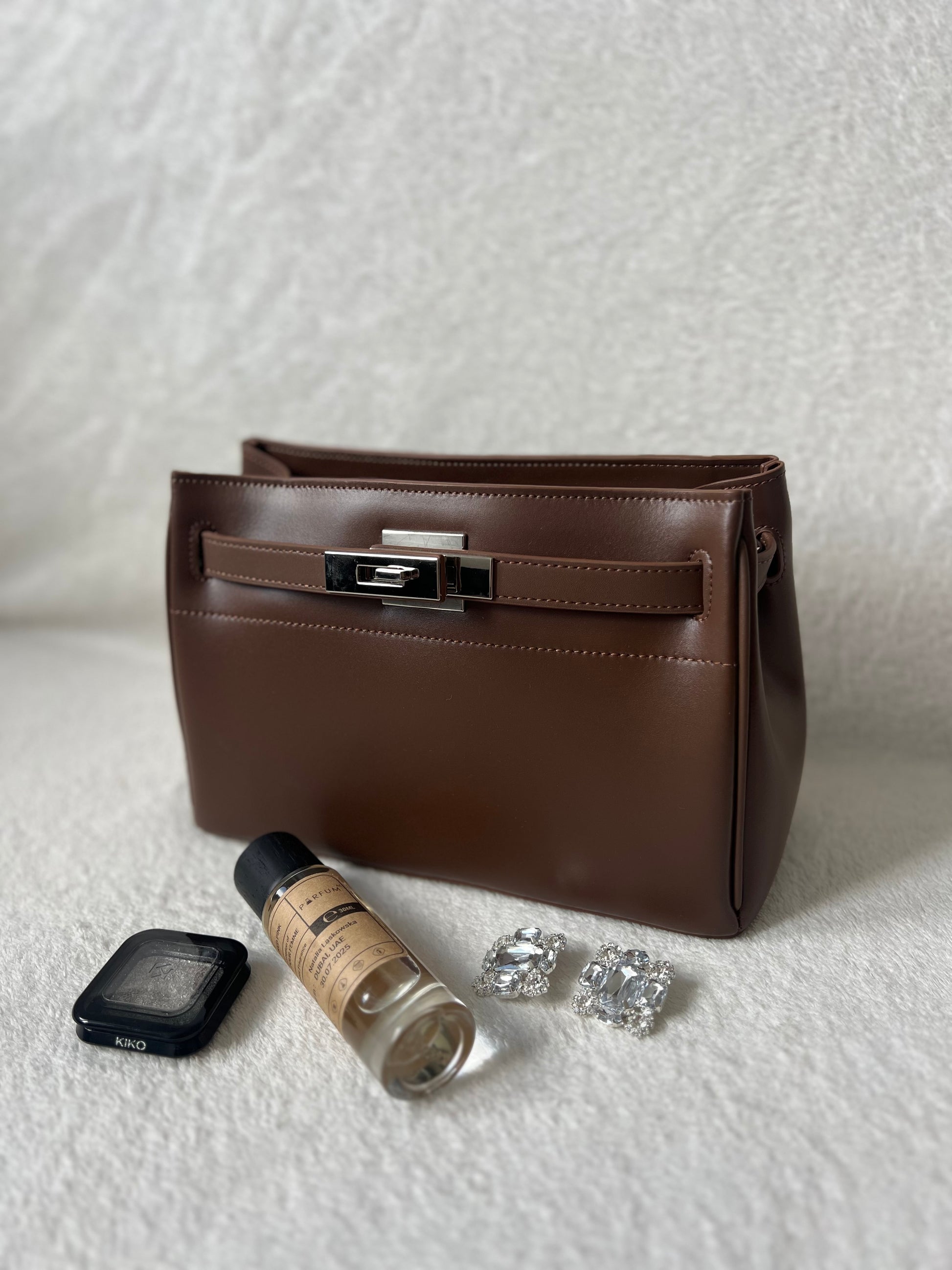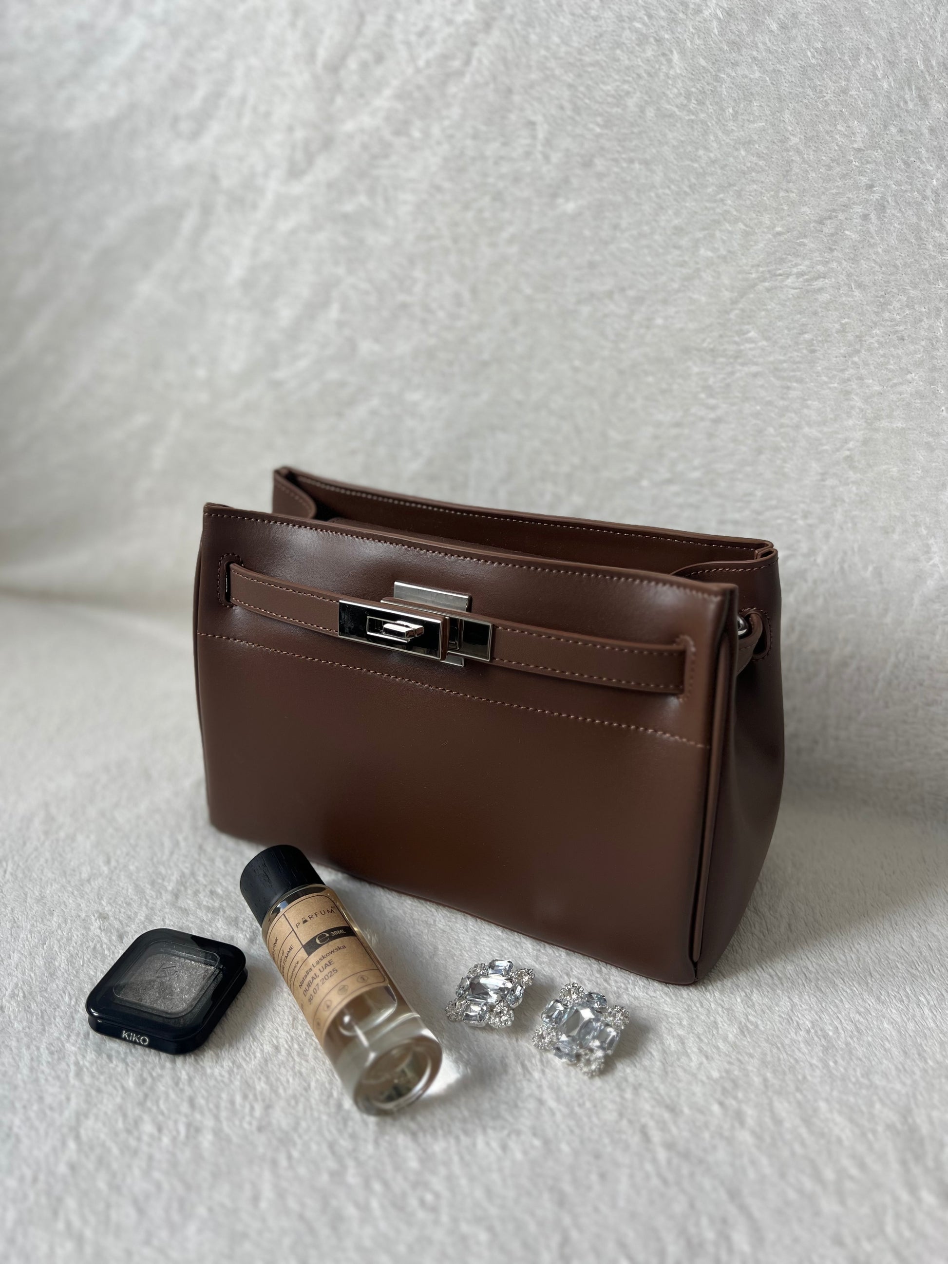 Elegant, compact handbag in smooth chocolate-brown natural leather.