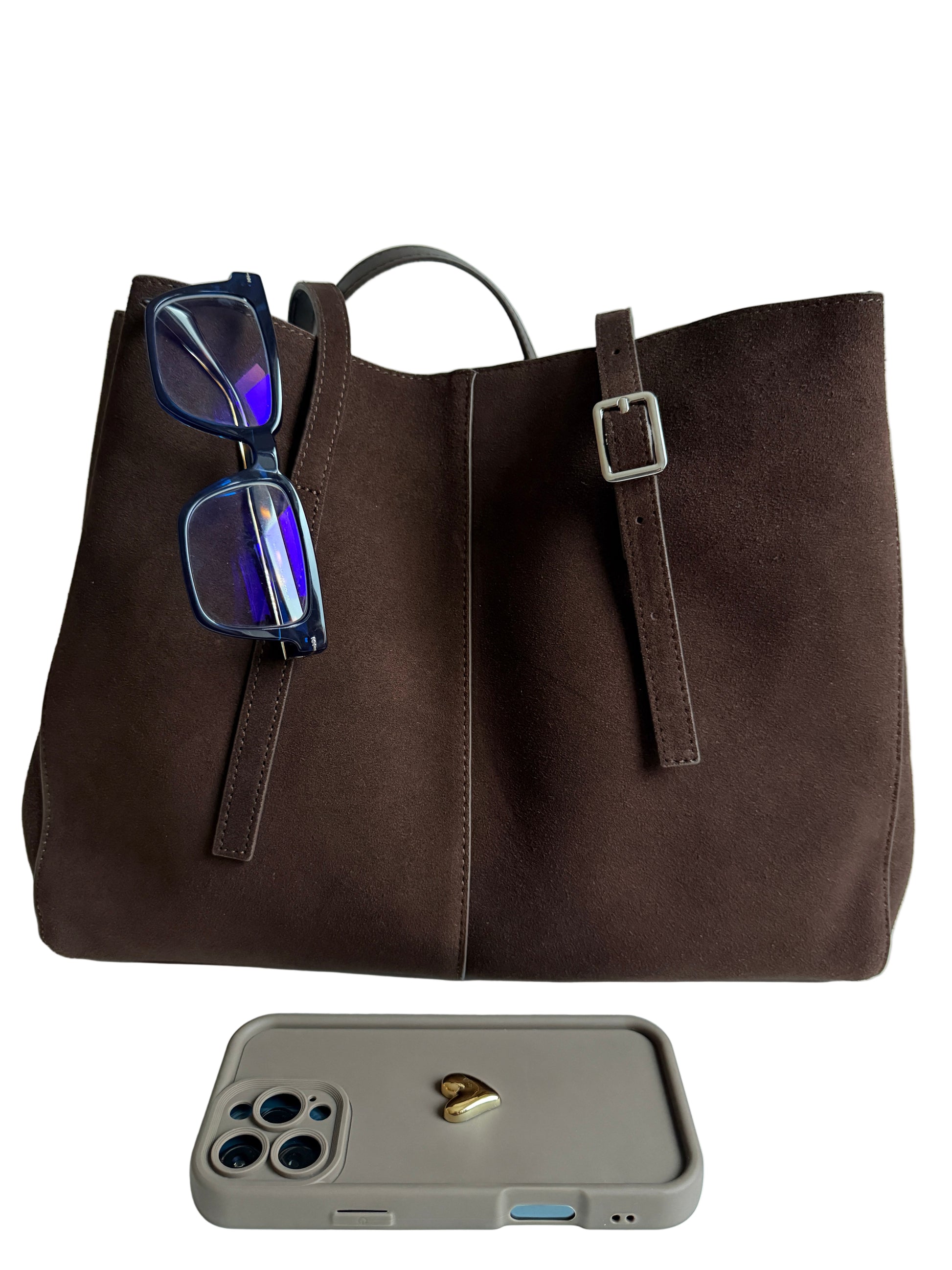 LOLA in deep dark chocolate suede — a rich and elegant natural leather handbag with maximum capacity.