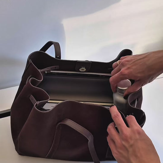 LOLA in taupe suede — a rich and elegant natural leather handbag with maximum capacity.