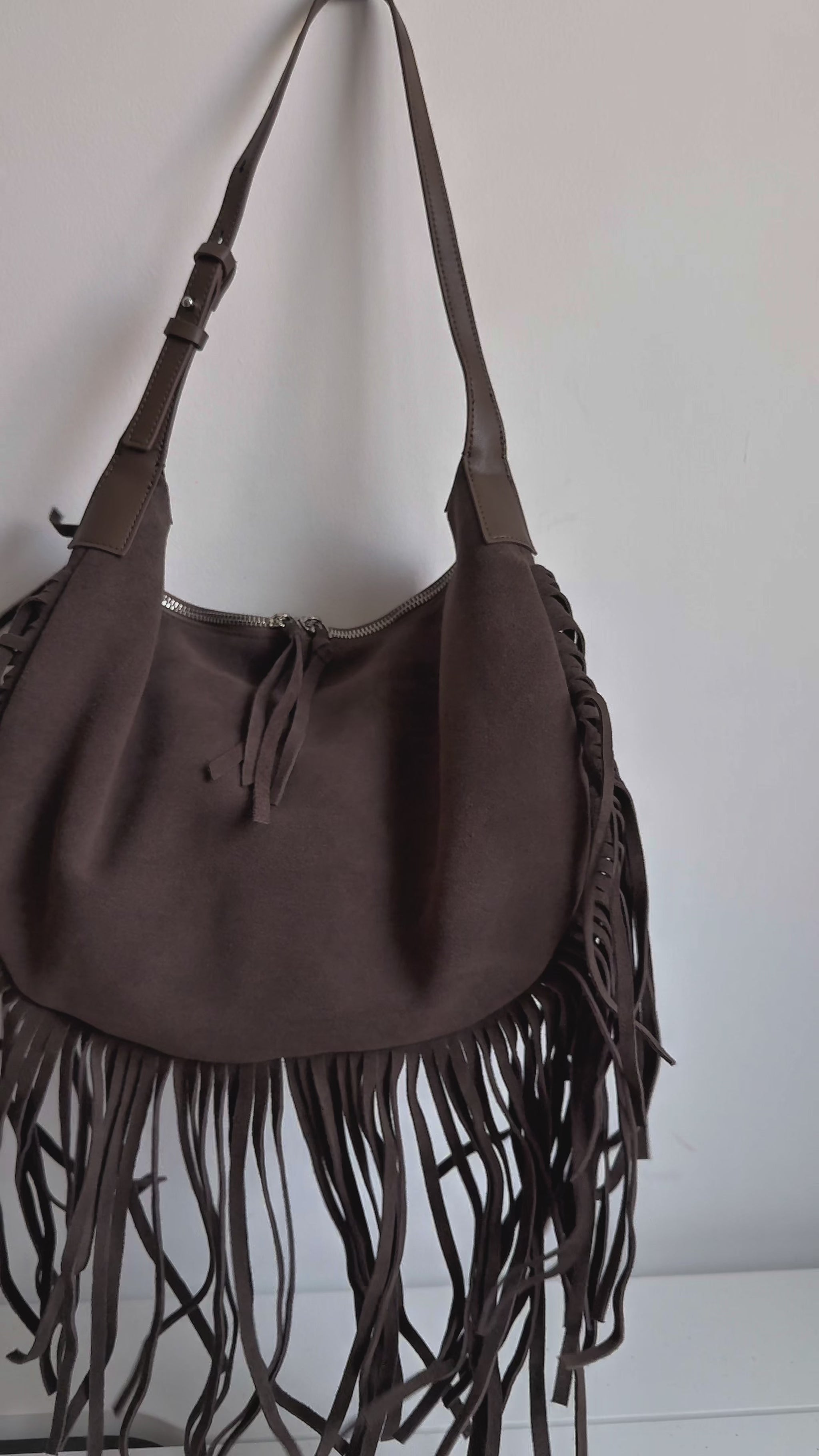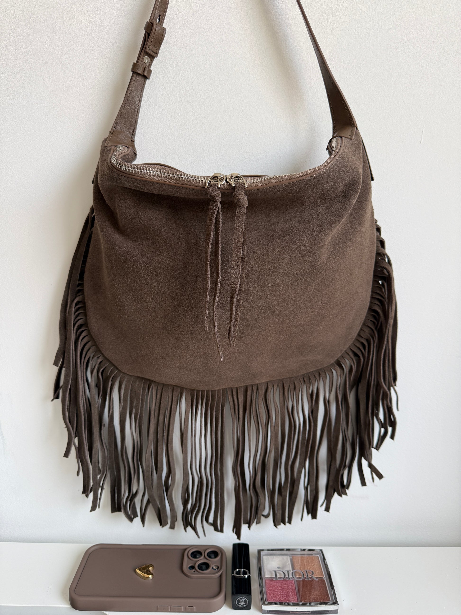 NIKOLÉ JANE – Taupe Suede Fringe Shoulder Bag | Western Chic